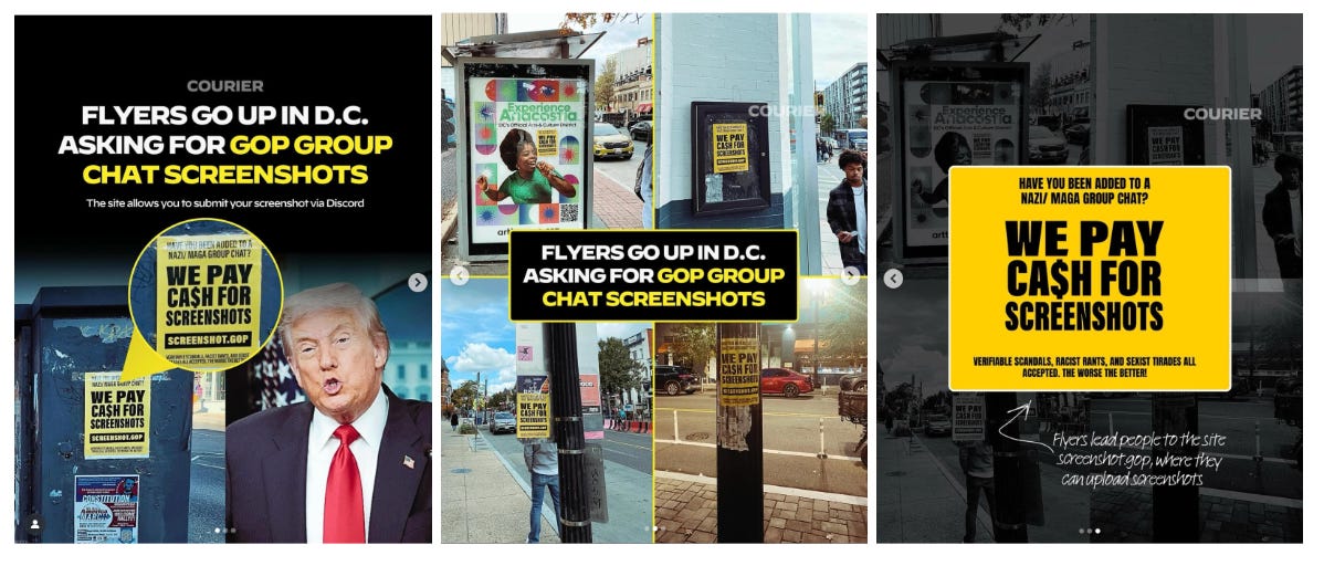 COURIER covered new flyers in D.C. that ask people to submit screenshots of GOP group chats. This comes on the heels of the leak of a disturbing Young Republicans group chat and the Trump admin’s ‘Signalgate.’