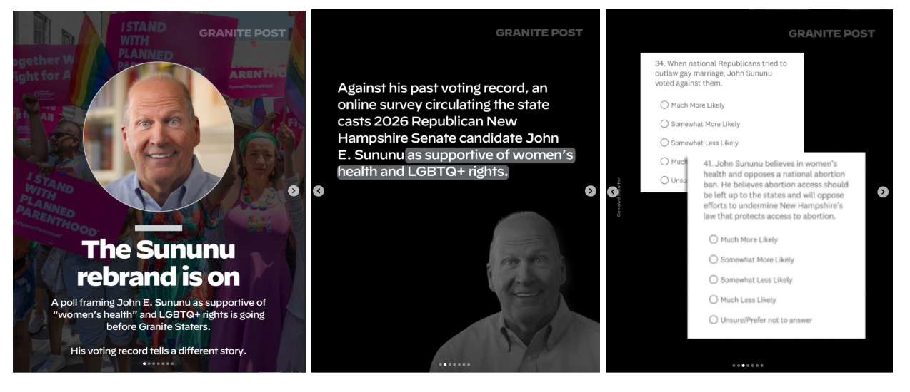 The John E. Sununu rebrand is on as he jumps into New Hampshire’s Senate race. COURIER’s Granite Post covers a new poll testing language framing Sununu as a supporter of “women’s health” and LGBTQ+ rights.