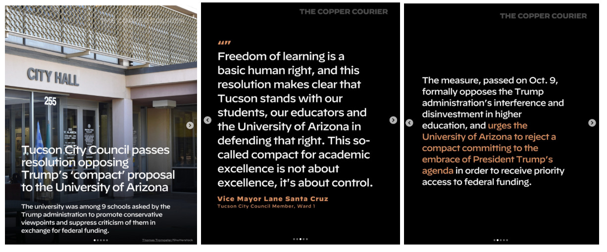 COURIER’s Arizona outlet, Copper Courier, reports on the unanimous Tucson City Council vote to urge the University of Arizona to reject a compact committing to the embrace of President Trump’s agenda.