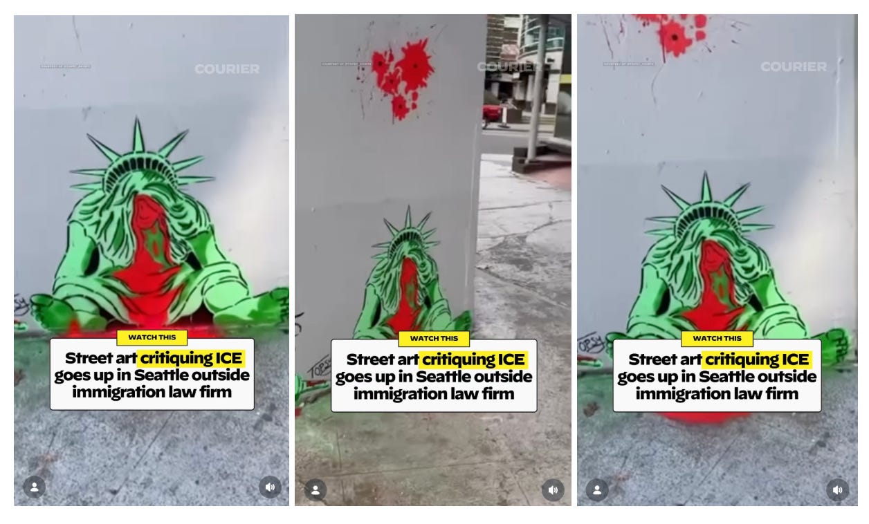 Street artist Topsy shared new art earlier this week, depicting the Statue of Liberty bleeding out after being shot. The art went up outside of an immigration law firm in Seattle, Washington.