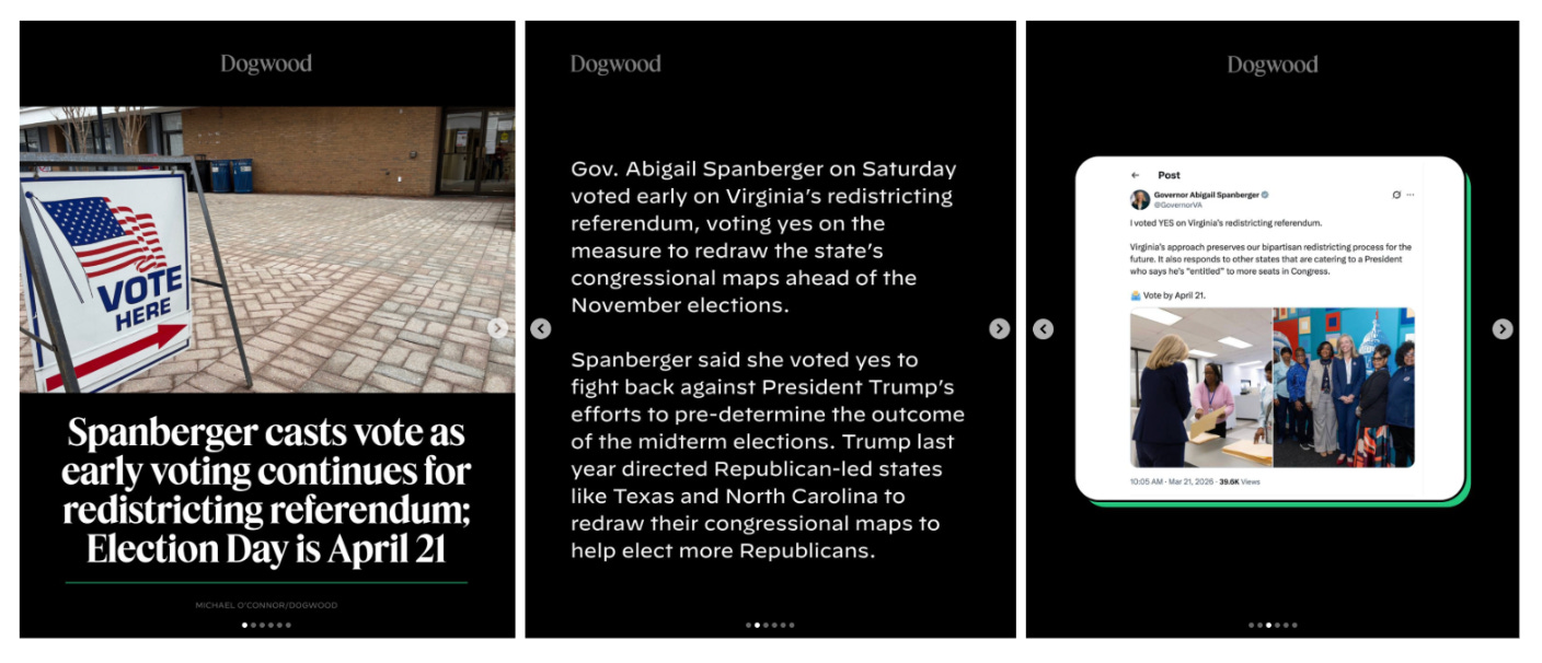 COURIER’s Virginia outpost, Dogwood, covers Gov. Abigail Spanberger’s support of Democrats’ push to redraw Virginia’s congressional districts and early voting in the state’s April 21st special election.