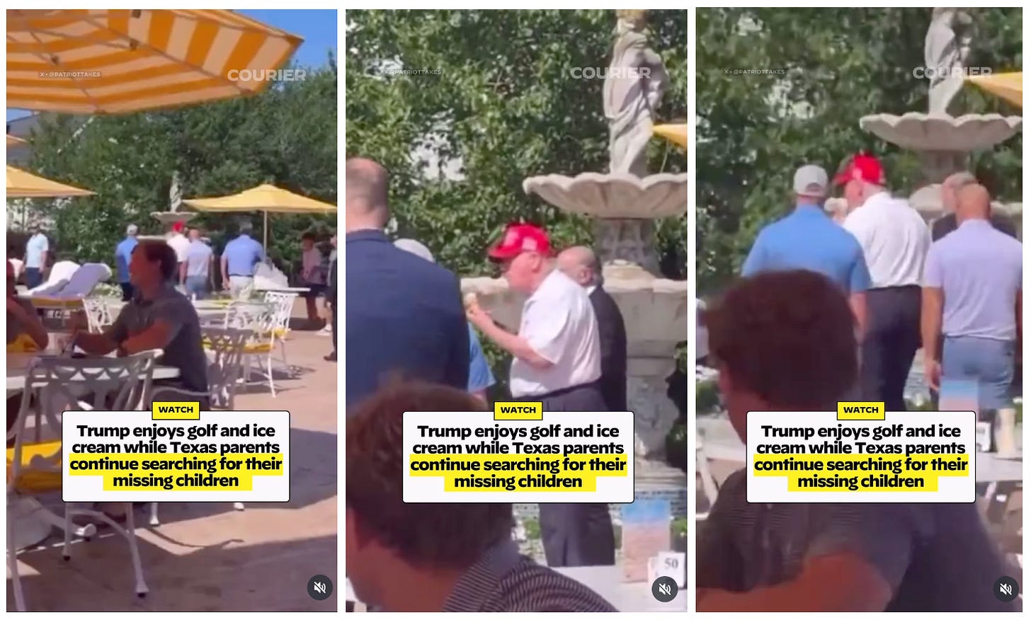 COURIER shared uncovered footage of President Trump eating ice cream at Trump National Golf Club Bedminster in New Jersey as the search for victims of the Texas flood remained ongoing.