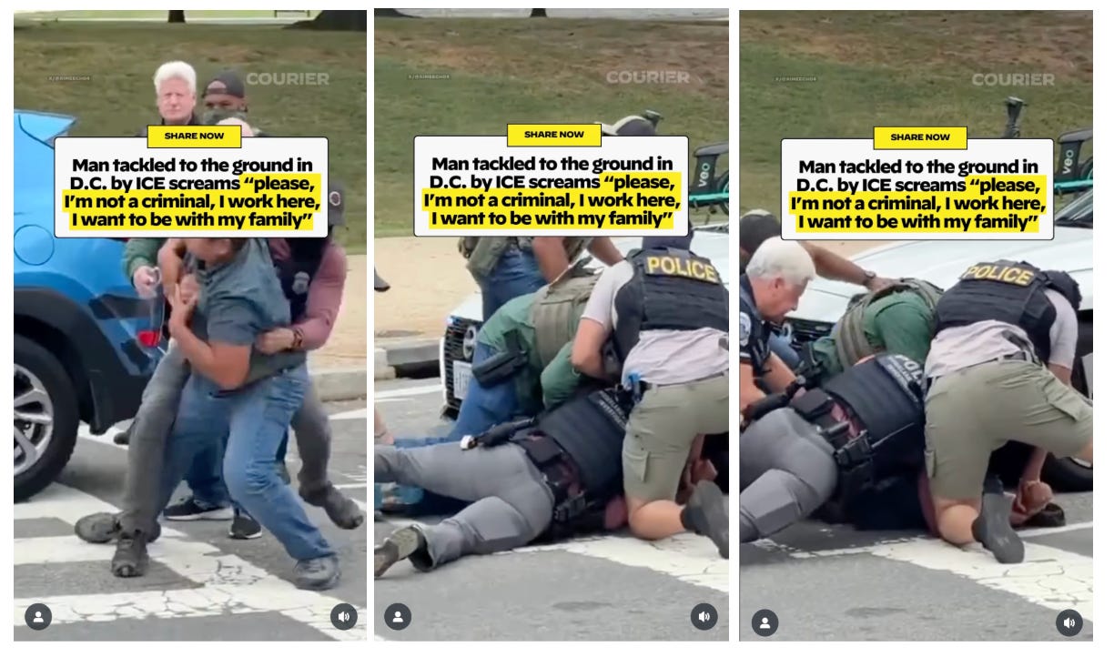 A reporter caught ICE tackling a man to the ground in D.C. on video as the man screamed for his family. When a bystander asked the agents what the man was being charged with, they did not reply. COURIER has the video.
