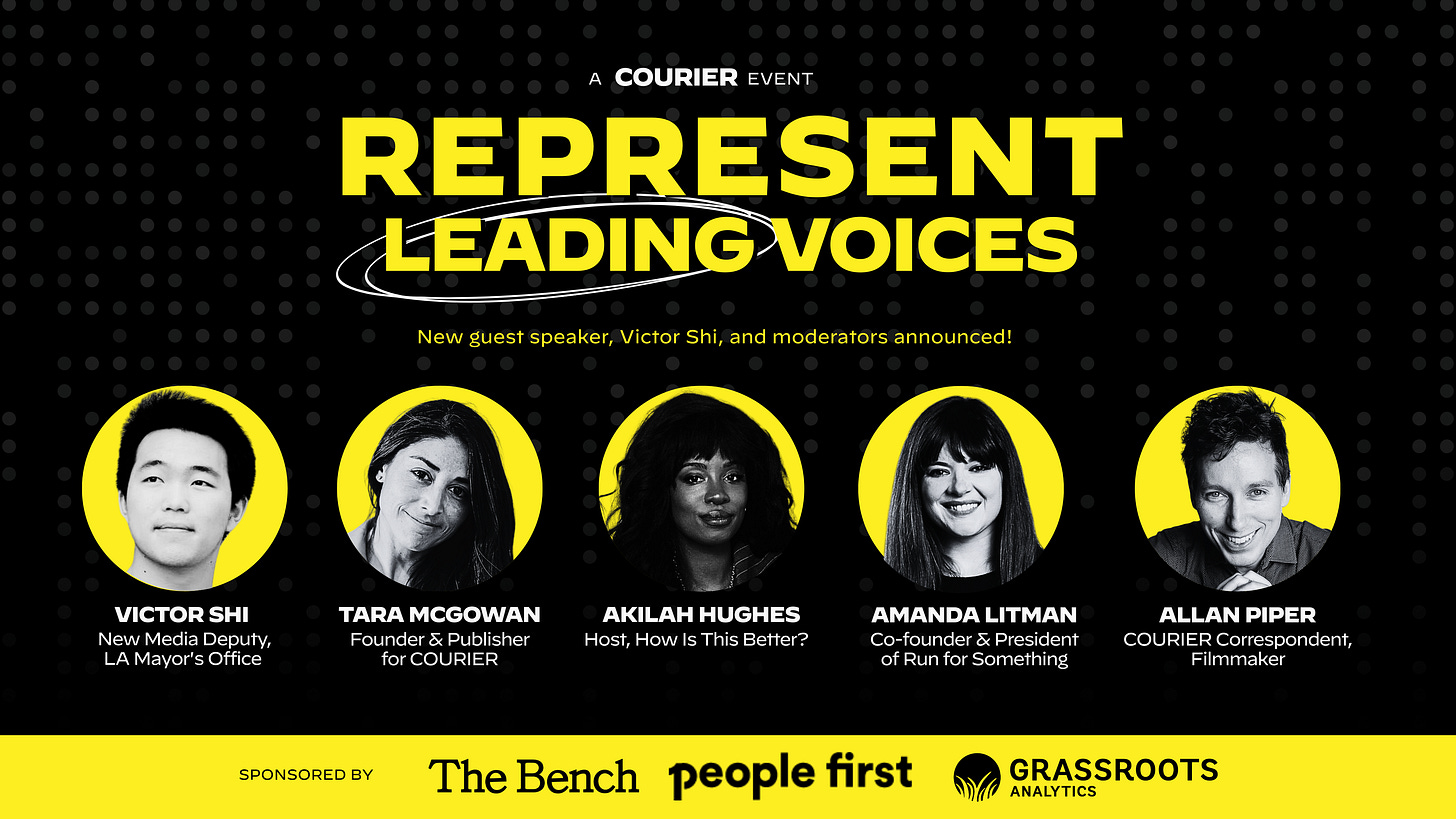 Join COURIER in NYC on September 10 for REPRESENT, a live event with the rising class of political leaders and digital creators discussing how to create media-powered movements, how campaigns effectively partner with content creators, and the new digital-first tactics + strategies needed to win.