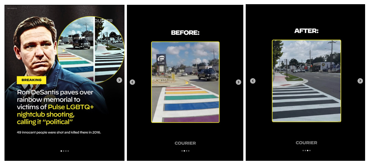 Florida Governor Ron DeSantis authorized the sudden overnight removal of a rainbow crosswalk at the Pulse nightclub memorial, a tribute to the 49 victims of the 2016 mass shooting in Orlando. COURIER took a look.