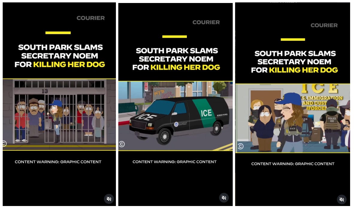 South Park showed Kristi Noem killing multiple dogs in their most recent episode. The show also took a hit at Noem’s appearance, as her face starts drooping, only to be fixed by makeup. COURIER shared the viral scene.